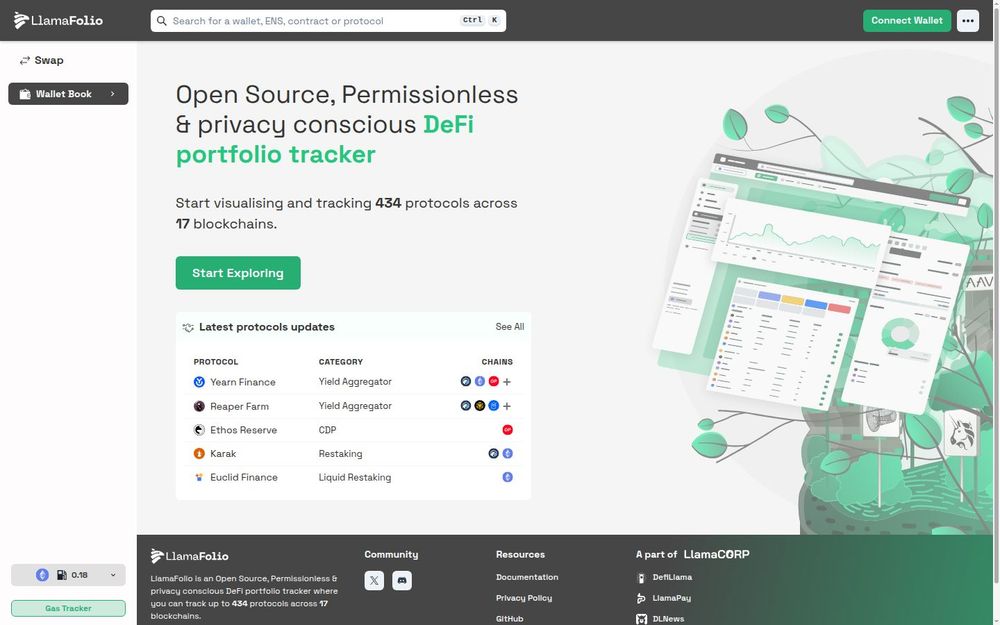 LlamaFolio is an open-source DeFi portfolio tracker designed to be permissionless and privacy conscious. The platform aims to provide clear visualizations and tracking across a broad range of chains and protocols, enabling users to monitor holdings, protocol exposure, and activity without depending on centralized or invasive data collection practices. The site highlights support for 434 protocols across 17 blockchains, and surfaces practical tools such as a Swap interface, a Wallet Book for wallet-oriented views, and a Gas Tracker for chain-specific gas insights. Community engagement is encouraged through feedback channels like a dedicated Discord server.