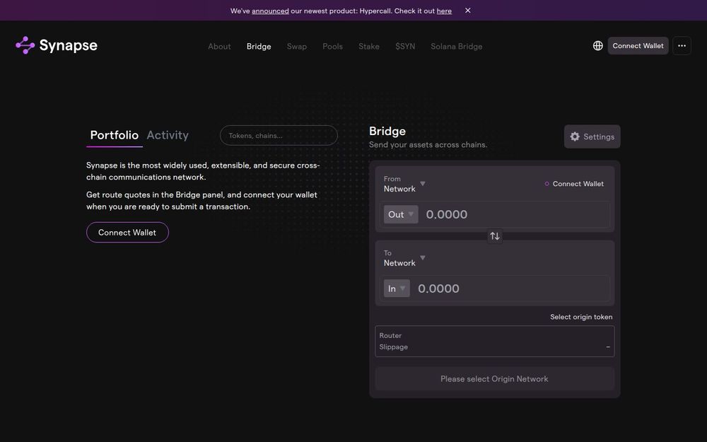 User Experience and Wallet Integration: Synapse includes UI affordances like Connect Wallet, Portfolio and Activity sections, and settings for slippage and routers. These features are designed to help users manage cross-chain operations, view recent and pending transactions, and configure transaction parameters before submission.