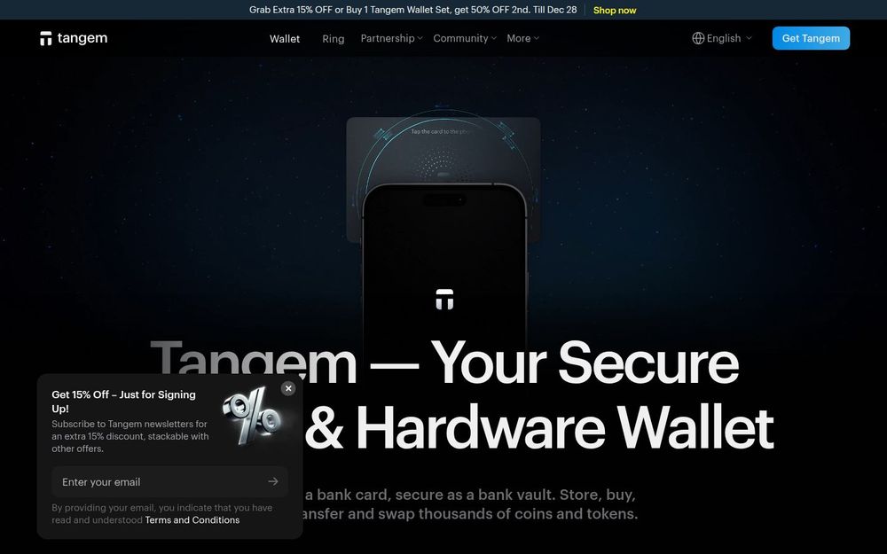 Tangem is a hardware-first crypto wallet built to make self-custody accessible, durable, and secure. The product is centered on a thin, card-like device (or ring) that contains a certified secure microchip. During activation the chip generates a truly random, non-extractable private key and stores it inside the secure element, ensuring private keys never leave the device. Paired with a feature-rich mobile app, Tangem enables on-the-go management of thousands of tokens, including buying, selling, swapping, staking and portfolio tracking.