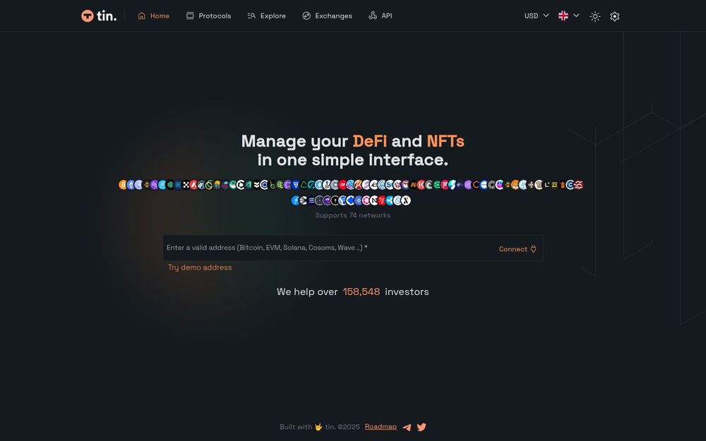 Tin is a browser-based dashboard and analytics tool built to help users manage their DeFi positions and NFT holdings across many blockchains from one consolidated interface. The product targets traders, investors, and collectors who interact with multiple networks and want a reliable, readable view of their assets, liquidity, and protocol exposure. Tin highlights multi-chain support with visual chain icons, an address-based dashboard, and quick preview/demo functionality to evaluate wallets without connecting a private key.
