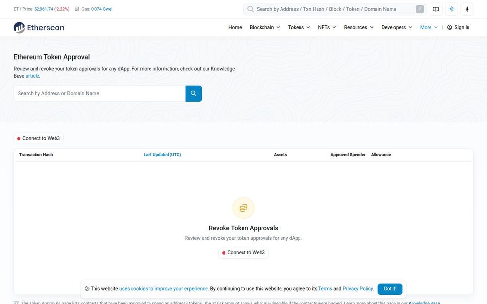Etherscan’s Token Approval Checker is a purpose-built interface for Ethereum users to review, audit, and revoke token approvals that have been granted to smart contracts and dApps. The tool consolidates approvals across major token standards — ERC-20, ERC-721, and ERC-1155 — and displays key details such as approved spenders, allowance amounts, and token identifiers. Designed to improve on-chain security awareness, the page helps users understand which contracts are authorized to move or manage their tokens and gives practical controls to reduce risk.