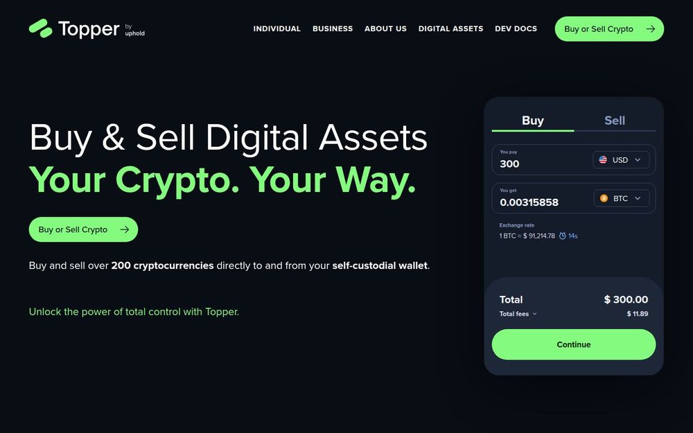 Topper is a digital asset brokerage focused on giving individuals fast, flexible access to cryptocurrency markets while preserving user control via self-custodial wallets. Designed for simplicity, Topper allows people to buy crypto instantly and sell it back to cash using widely available payment rails. The platform supports more than 200 cryptocurrencies, from major assets like Bitcoin and Ethereum to stablecoins and popular meme coins, making it a one-stop solution for a broad set of user needs.
