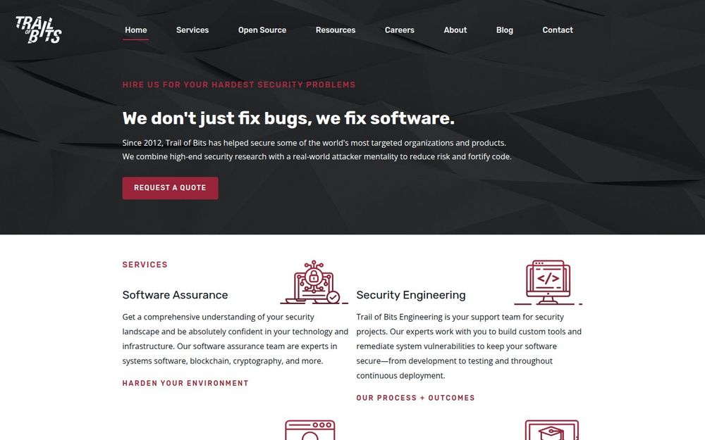 Research & Development: Independent, high-impact security research that advances the state of knowledge in vulnerability discovery, program analysis, and secure system design. Trail of Bits publishes findings and develops methods that the security community can adopt.