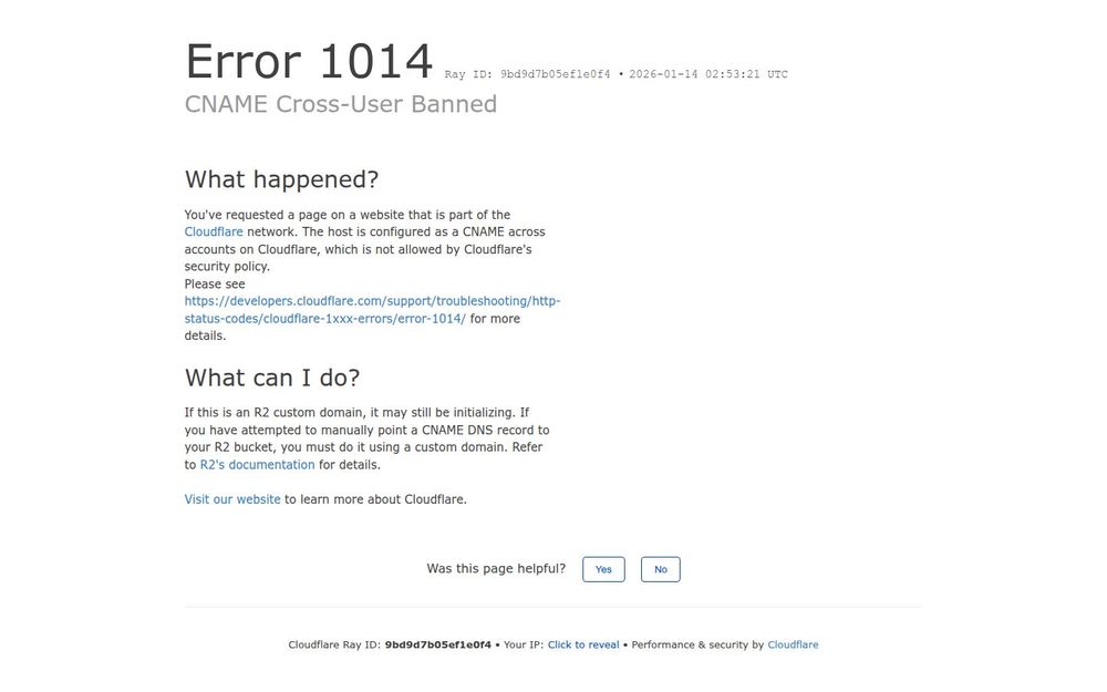 For site owners/administrators: verify DNS records, ensure the domain’s CNAME target is part of the same Cloudflare account, and follow Cloudflare’s guidance on Error 1014. If using R2 or an external bucket, complete the custom domain setup and verification as described in Cloudflare’s documentation.