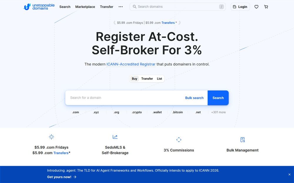 Unstoppable Domains is a domain platform that combines traditional DNS registration services with Web3 innovation. As an ICANN-accredited registrar, it sells and manages conventional DNS TLDs while also issuing tokenized onchain counterparts that represent the DNS domain as a tradable digital asset. The platform is designed for domain investors, marketplaces, and everyday users who want the familiarity of registrar workflows along with the speed and flexibility of blockchain-based transfers. Key selling points include low fees, rapid onchain settlement, integrated marketplace distribution, and an embedded custody wallet that hides Web3 complexity from non-technical users.