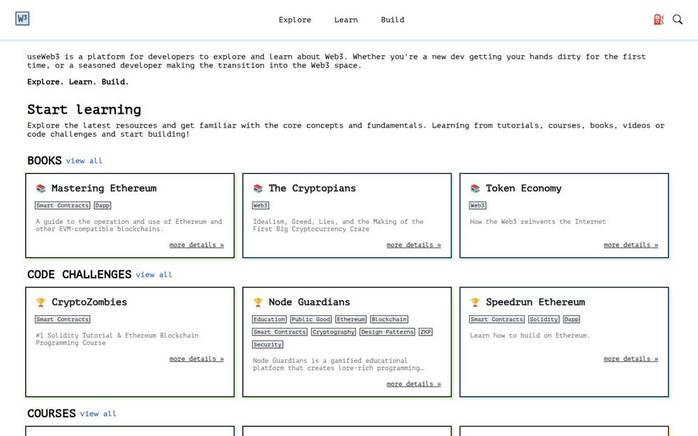 useWeb3 is a focused educational hub for developers interested in Web3 technologies and decentralized application development. The platform aggregates high-quality resources across multiple formats—books, tutorials, videos, courses, starter kits, and code challenges—so learners can discover both conceptual explanations and hands-on projects. It targets a wide spectrum of users: those new to blockchain who want foundational knowledge, intermediate engineers looking to build dApps and smart contracts, and experienced developers seeking advanced topics like zero-knowledge proofs and security best practices.