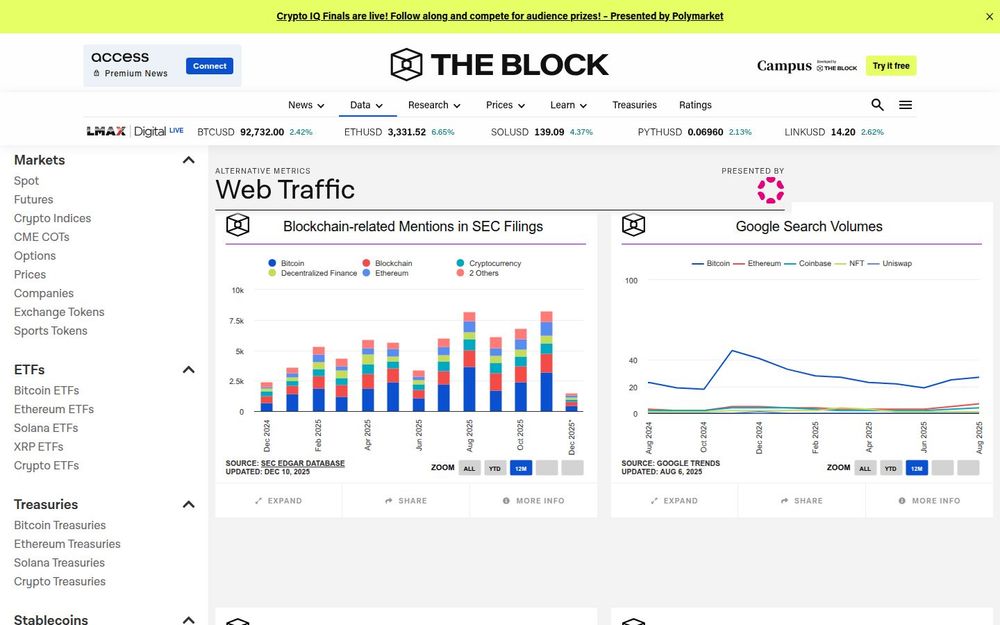 The Block’s Web Traffic dashboard is part of The Block Data suite and sits under the site’s Alternative Metrics section. It compiles off-chain signals — primarily website traffic and search interest — into interactive visualizations designed to give analysts, researchers and market participants a complementary perspective to on-chain data. By combining sources such as Google Trends and the SEC EDGAR database with charting controls and exportable views, the dashboard helps surface changes in public attention, platform adoption and topical interest across the crypto ecosystem.