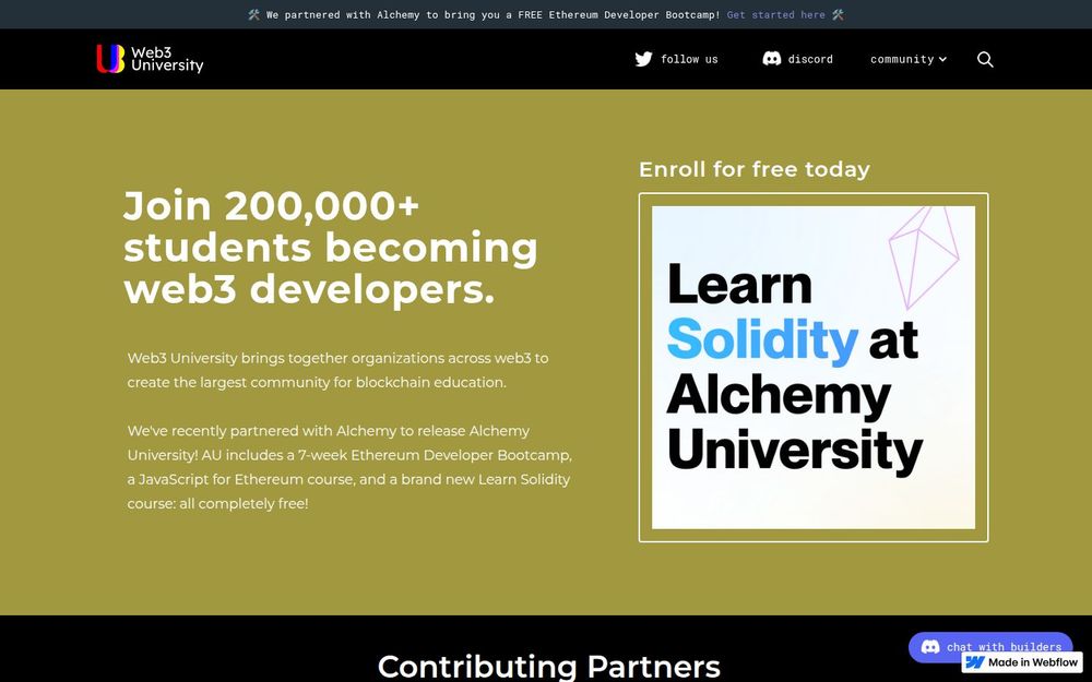 Partner Bootcamps & Courses: Through partnerships (notably with Alchemy), Web3 University surfaces free bootcamps and multi-week courses—such as the Ethereum Developer Bootcamp and Learn Solidity content—bringing industry-backed curricula and instructor-led content to learners.