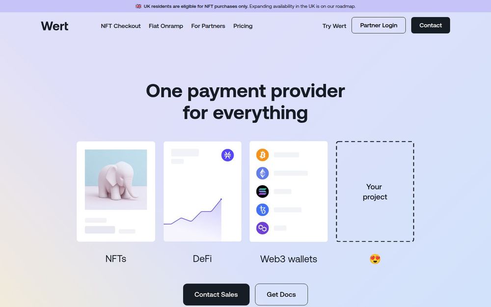 Wert is a unified payment provider focused on bridging fiat and web3 ecosystems, offering services such as NFT checkout and fiat onramp to enable card payments, token purchases, and seamless onboarding for non-crypto-native users. The platform targets projects building NFTs, DeFi products, and Web3 wallets by supplying integration options for web, mobile, dapps, and larger platforms. Wert emphasizes compliance and trust by operating under licensed entities (SHA2 Solutions) and leveraging established financial and security partners like Nuvei, Elliptic, WorldPay, Sardine, and Finery Markets. Roadmap items include broader UK availability, DeFi access, and off-ramp capabilities, while developer resources include integration docs, a partner portal, pricing pages, and a public roadmap for feature voting. The service is positioned to help projects scale without expensive centralized exchange listings and to support fiat-to-crypto flows with regulatory controls and enterprise-grade partners.