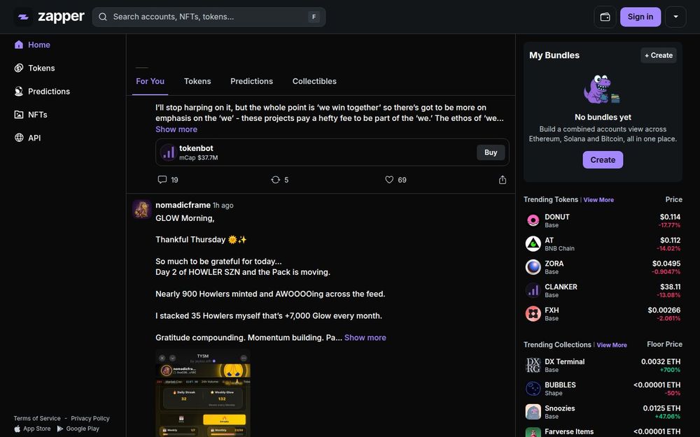 To start, visit the homepage, use the search bar to input an account address or token name, or browse the Tokens and NFTs sections. Create a bundle to group multiple addresses, sign in for personalized features, or explore the API documentation if you’re building integrations. Zapper is best used as a visibility and analytics layer to complement wallet and marketplace actions rather than a custody or transaction execution tool.